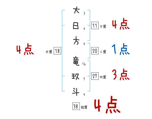 天運![]() | 大日方竜玖斗さんの天運は11画の4つ星!着実に富や地位を得る幸運な人生。 家系が持つ宿命的な運勢を表します。祖先から受け継いだ苗字ですので自分の力が及びません。家柄を象徴します。 |