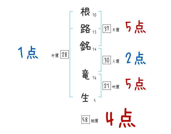 総運![]() | 根路銘竜生さんの総運は58画の4つ星!安定した生活。大器晩成タイプ。 あなたの人生を表す1番重要な運勢です。生涯を通じて影響する総合運となり、主に50歳以降の晩年期に影響を及ぼします。 |