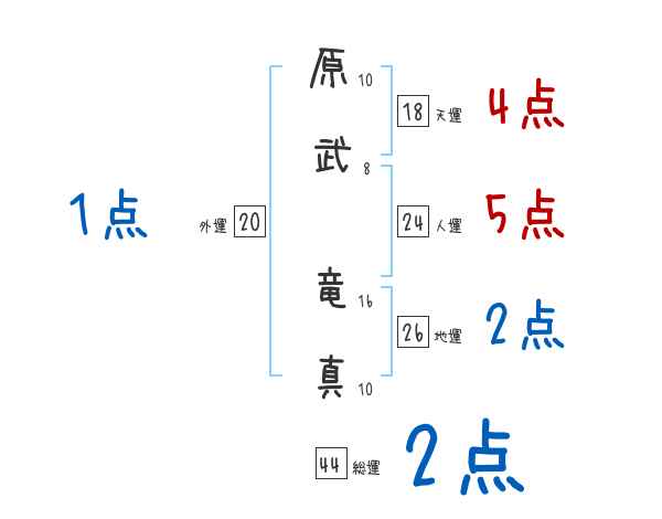 天運![]() | 原武竜真さんの天運は18画の4つ星!情熱的で剛気。忍耐力があり信頼される。 家系が持つ宿命的な運勢を表します。祖先から受け継いだ苗字ですので自分の力が及びません。家柄を象徴します。 |