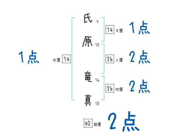 外運![]() | 氏原竜真さんの外運は14画の1つ星!人に対して優しいがストレスを溜め込みがち。人間関係のトラブルを避けるよう気をつけましょう。 生活面を象徴する運勢です。外部から受ける影響力を表し、結婚運、家庭運や職場、環境への順応性を表します。 |