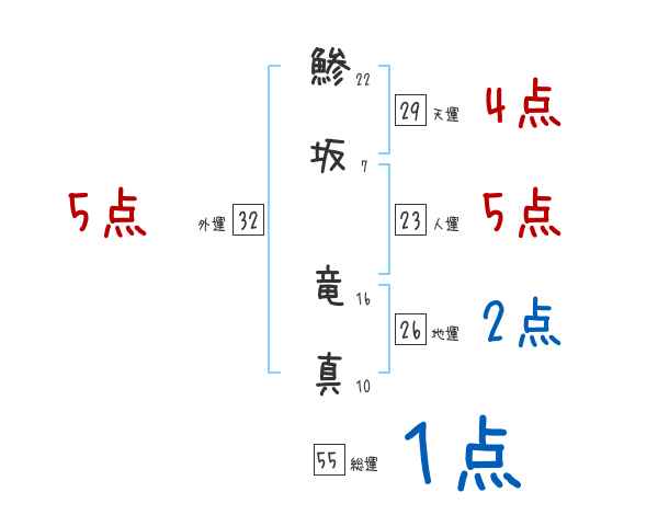 人運![]() | 鯵坂竜真さんの人運は23画の5つ星!想像力に優れ活力がある。一代で成功し名誉を手に入れる。 性格や才能などを表す2番目に重要な運勢です。人間関係や協調性、社会的な成功に影響します。主に20歳から50歳ぐらいまでの中年期の運勢を表します。 |