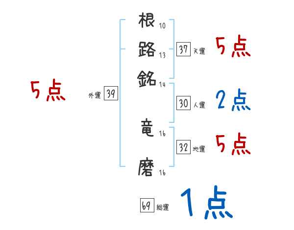 外運![]() | 根路銘竜磨さんの外運は39画の5つ星!社交性に優れ人望が厚い。人の上に立ち成功する。 生活面を象徴する運勢です。外部から受ける影響力を表し、結婚運、家庭運や職場、環境への順応性を表します。 |