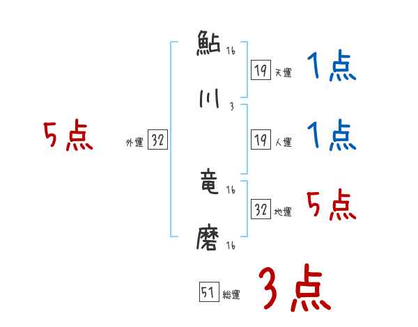 外運![]()  | 鮎川竜磨さんの外運は32画の5つ星!柔軟性があり成功する。チャンスが多く金運が良い。 生活面を象徴する運勢です。外部から受ける影響力を表し、結婚運、家庭運や職場、環境への順応性を表します。 |