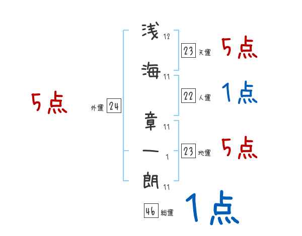 天運![]() | 浅海章一朗さんの天運は23画の5つ星!想像力に優れ活力がある。一代で成功し名誉を手に入れる。 家系が持つ宿命的な運勢を表します。祖先から受け継いだ苗字ですので自分の力が及びません。家柄を象徴します。 |