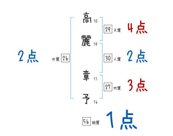 外運![]() | 高麗章予さんの外運は26画の2つ星!波瀾万丈かも。信頼できる人を大事にしましょう。 生活面を象徴する運勢です。外部から受ける影響力を表し、結婚運、家庭運や職場、環境への順応性を表します。 |