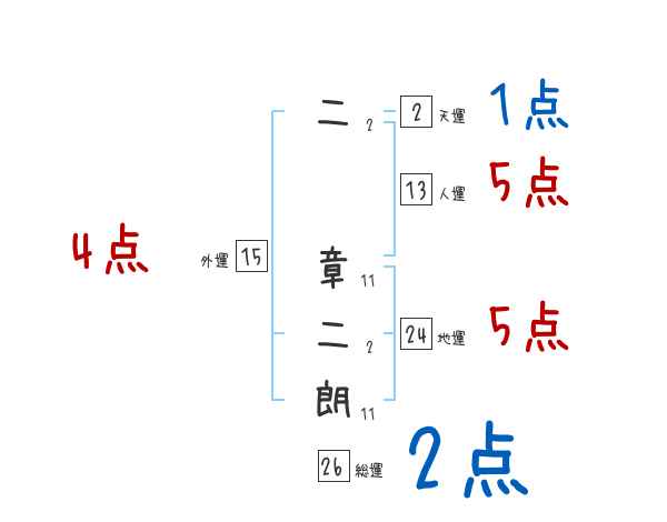 総運![]() | 二章二朗さんの総運は26画の2つ星!波瀾万丈かも。信頼できる人を大事にしましょう。 あなたの人生を表す1番重要な運勢です。生涯を通じて影響する総合運となり、主に50歳以降の晩年期に影響を及ぼします。 |