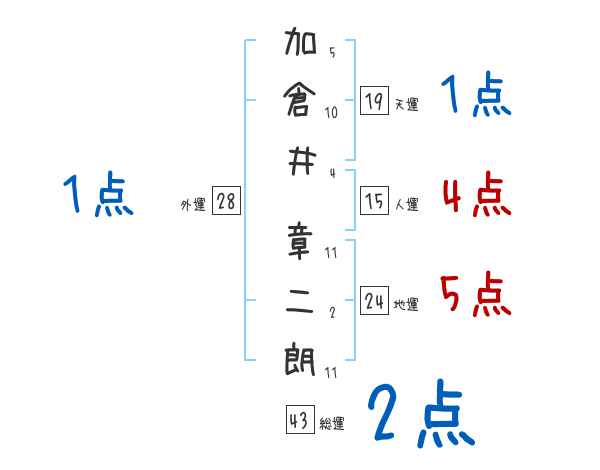 総運![]() | 加倉井章二朗さんの総運は43画の2つ星!頑固な性格で独立心が強いかも。やや非現実的で浪費に注意しましょう。 あなたの人生を表す1番重要な運勢です。生涯を通じて影響する総合運となり、主に50歳以降の晩年期に影響を及ぼします。 |