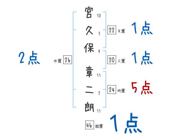 外運![]() | 宮久保章二朗さんの外運は26画の2つ星!波瀾万丈かも。信頼できる人を大事にしましょう。 生活面を象徴する運勢です。外部から受ける影響力を表し、結婚運、家庭運や職場、環境への順応性を表します。 |