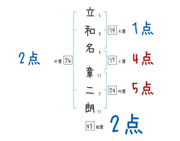 総運![]() | 立和名章二朗さんの総運は43画の2つ星!頑固な性格で独立心が強いかも。やや非現実的で浪費に注意しましょう。 あなたの人生を表す1番重要な運勢です。生涯を通じて影響する総合運となり、主に50歳以降の晩年期に影響を及ぼします。 |