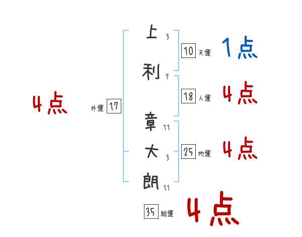 | 外運  | 上利章大朗さんの外運は17画の4つ星!積極的な行動力。地位を気づき財産を手に入れる。純粋な心と直感力。生活面を象徴する運勢です。外部から受ける影響力を表し、結婚運、家庭運や職場、環境への順応性を表します。 |