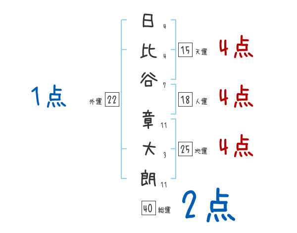 外運![]() | 日比谷章大朗さんの外運は22画の1つ星!努力することが苦手ないっぽう手先が器用。芸術性にも優れる。 生活面を象徴する運勢です。外部から受ける影響力を表し、結婚運、家庭運や職場、環境への順応性を表します。 |