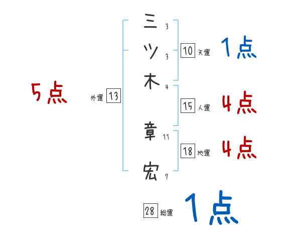 総運![]() | 三ツ木章宏さんの総運は28画の1つ星!家庭環境に注意。スポーツで活躍できる能力があるかも。 あなたの人生を表す1番重要な運勢です。生涯を通じて影響する総合運となり、主に50歳以降の晩年期に影響を及ぼします。 |