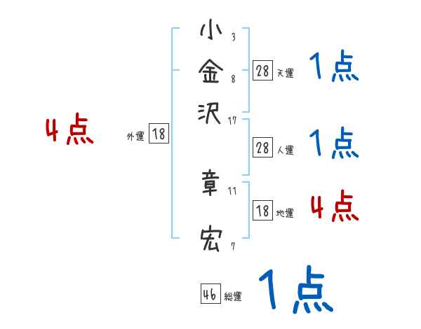 人運![]() | 小金沢章宏さんの人運は28画の1つ星!家庭環境に注意。スポーツで活躍できる能力があるかも。 性格や才能などを表す2番目に重要な運勢です。人間関係や協調性、社会的な成功に影響します。主に20歳から50歳ぐらいまでの中年期の運勢を表します。 |