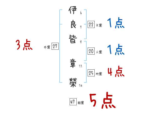 総運![]() | 伊良皆章榮さんの総運は47画の5つ星!実力が開花し発展する円満な人生。財に恵まれる。 あなたの人生を表す1番重要な運勢です。生涯を通じて影響する総合運となり、主に50歳以降の晩年期に影響を及ぼします。 |