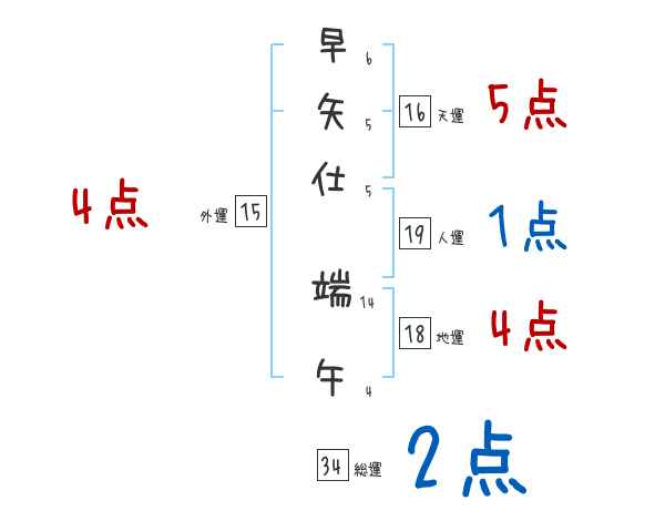 天運![]() | 早矢仕端午さんの天運は16画の5つ星!人望が厚く大きく発展する。逆転成功が見える。 家系が持つ宿命的な運勢を表します。祖先から受け継いだ苗字ですので自分の力が及びません。家柄を象徴します。 |