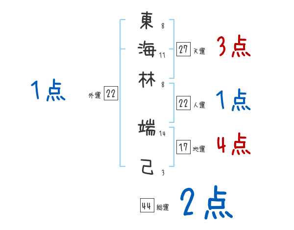 総運![]() | 東海林端己さんの総運は44画の2つ星!誠実で慎重な性格。物事を考えすぎないように注意しましょう。 あなたの人生を表す1番重要な運勢です。生涯を通じて影響する総合運となり、主に50歳以降の晩年期に影響を及ぼします。 |