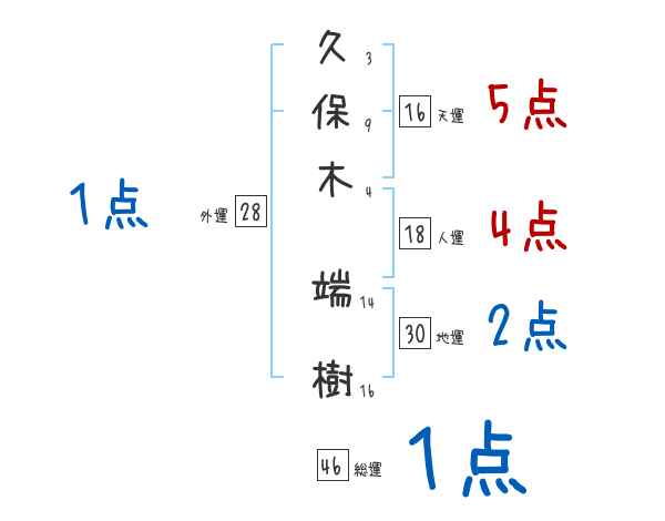 総運![]() | 久保木端樹さんの総運は46画の1つ星!迷走することが多く苦労するかも。目先のことにとらわれないように。 あなたの人生を表す1番重要な運勢です。生涯を通じて影響する総合運となり、主に50歳以降の晩年期に影響を及ぼします。 |