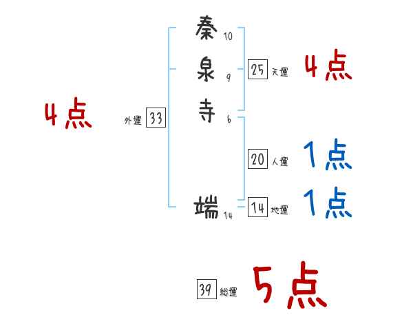 天運![]() | 秦泉寺端さんの天運は25画の4つ星!個性があり才能があふれる。強運の持ち主で発展する。 家系が持つ宿命的な運勢を表します。祖先から受け継いだ苗字ですので自分の力が及びません。家柄を象徴します。 |