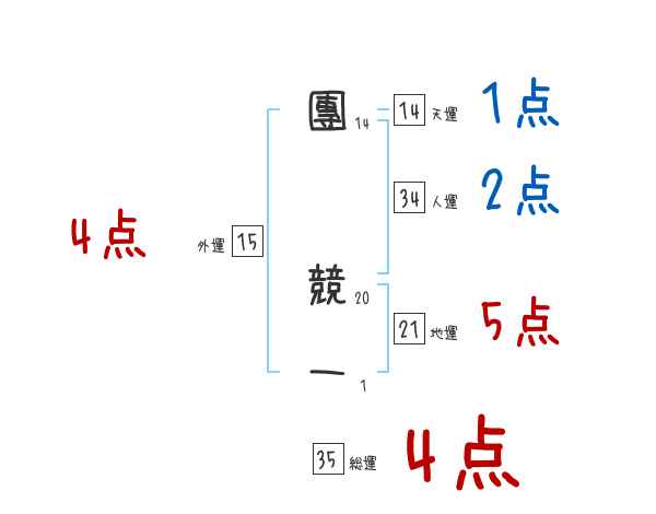人運![]() | 團競一さんの人運は34画の2つ星!独創性に優れるが、自尊心が強く災難に注意しましょう。 性格や才能などを表す2番目に重要な運勢です。人間関係や協調性、社会的な成功に影響します。主に20歳から50歳ぐらいまでの中年期の運勢を表します。 |
