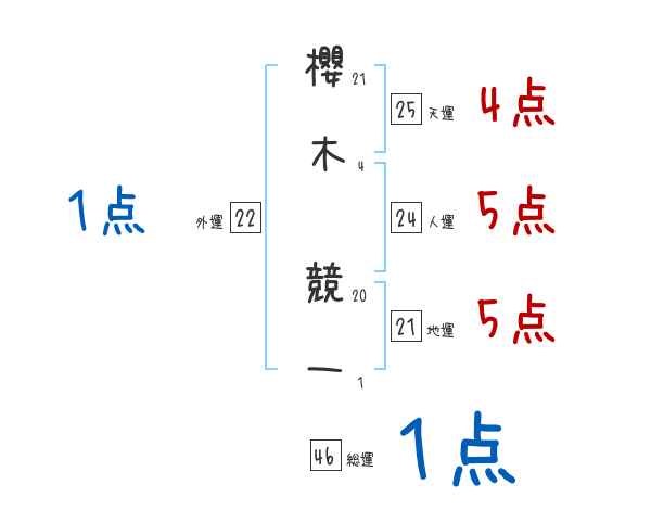 外運![]() | 櫻木競一さんの外運は22画の1つ星!努力することが苦手ないっぽう手先が器用。芸術性にも優れる。 生活面を象徴する運勢です。外部から受ける影響力を表し、結婚運、家庭運や職場、環境への順応性を表します。 |