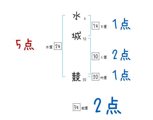 総運![]() | 水城競さんの総運は34画の2つ星!独創性に優れるが、自尊心が強く災難に注意しましょう。 あなたの人生を表す1番重要な運勢です。生涯を通じて影響する総合運となり、主に50歳以降の晩年期に影響を及ぼします。 |