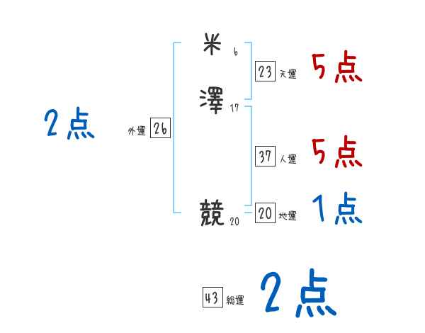 天運![]() | 米澤競さんの天運は23画の5つ星!想像力に優れ活力がある。一代で成功し名誉を手に入れる。 家系が持つ宿命的な運勢を表します。祖先から受け継いだ苗字ですので自分の力が及びません。家柄を象徴します。 |