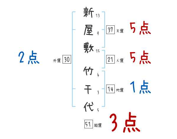 総運![]() | 新屋敷竹千代さんの総運は51画の3つ星!変化が激しく、危険に注意。堅実な性格。 あなたの人生を表す1番重要な運勢です。生涯を通じて影響する総合運となり、主に50歳以降の晩年期に影響を及ぼします。 |