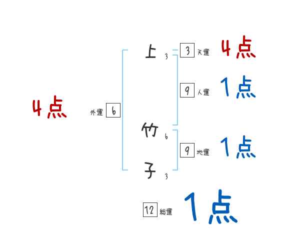 天運![]() | 上竹子さんの天運は3画の4つ星!活動的で才能に恵まれ、多くの信頼を得る。希望に満ち成長する。 家系が持つ宿命的な運勢を表します。祖先から受け継いだ苗字ですので自分の力が及びません。家柄を象徴します。 |