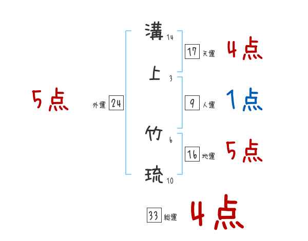 外運![]() | 溝上竹琉さんの外運は24画の5つ星!家庭運が良く順調な人生。金運にも恵まれる。 生活面を象徴する運勢です。外部から受ける影響力を表し、結婚運、家庭運や職場、環境への順応性を表します。 |