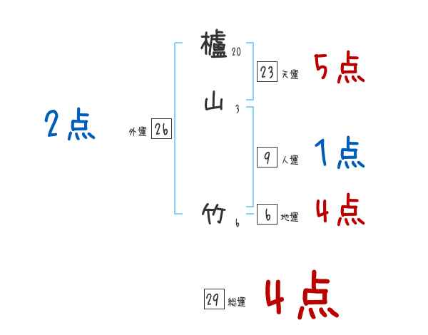 天運![]() | 櫨山竹さんの天運は23画の5つ星!想像力に優れ活力がある。一代で成功し名誉を手に入れる。 家系が持つ宿命的な運勢を表します。祖先から受け継いだ苗字ですので自分の力が及びません。家柄を象徴します。 |