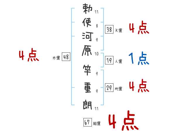 外運![]() | 勅使河原竿重朗さんの外運は48画の4つ星!賢明な性格で人望が厚い。指導力があり多くの人に尊敬される。 生活面を象徴する運勢です。外部から受ける影響力を表し、結婚運、家庭運や職場、環境への順応性を表します。 |