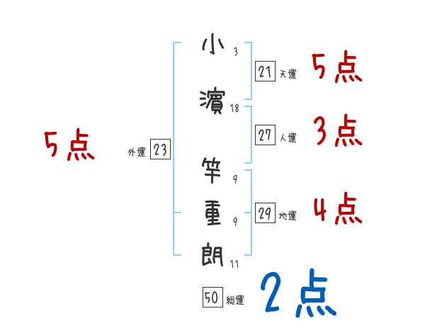 天運![]() | 小濵竿重朗さんの天運は21画の5つ星!統率力がある。独立し成功する。名誉を手に入れる。 家系が持つ宿命的な運勢を表します。祖先から受け継いだ苗字ですので自分の力が及びません。家柄を象徴します。 |