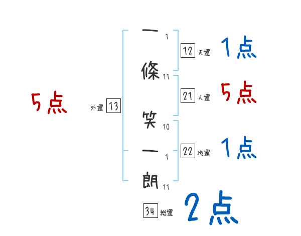 天運![]() | 一條笑一朗さんの天運は12画の1つ星!簡単な失敗で諦めてしまいやすいかも。着実に行動すると良いでしょう。 家系が持つ宿命的な運勢を表します。祖先から受け継いだ苗字ですので自分の力が及びません。家柄を象徴します。 |