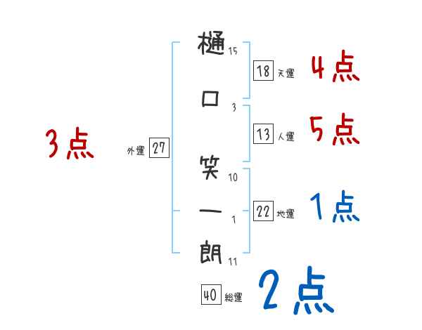 人運![]() | 樋口笑一朗さんの人運は13画の5つ星!才能に恵まれ人気がある。名声を手に入れる。円満な人生。 性格や才能などを表す2番目に重要な運勢です。人間関係や協調性、社会的な成功に影響します。主に20歳から50歳ぐらいまでの中年期の運勢を表します。 |