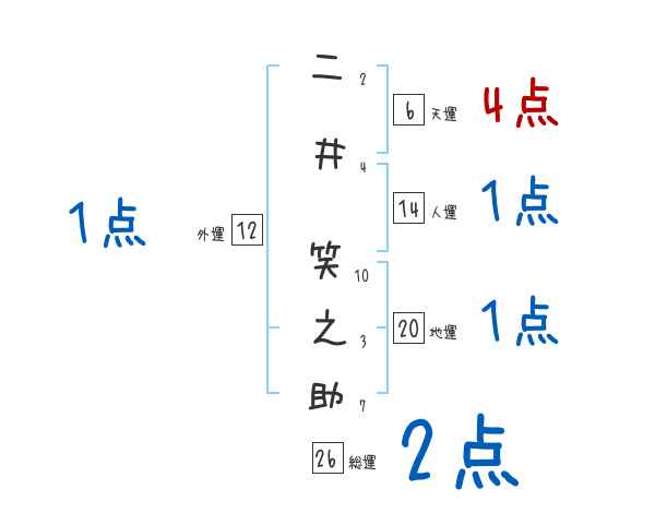 天運![]() | 二井笑之助さんの天運は6画の4つ星!慎重な努力家で信頼を得る。誠実な精神で向上心に優れる。 家系が持つ宿命的な運勢を表します。祖先から受け継いだ苗字ですので自分の力が及びません。家柄を象徴します。 |