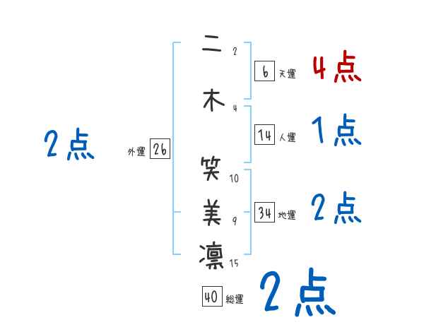 外運![]() | 二木笑美凛さんの外運は26画の2つ星!波瀾万丈かも。信頼できる人を大事にしましょう。 生活面を象徴する運勢です。外部から受ける影響力を表し、結婚運、家庭運や職場、環境への順応性を表します。 |