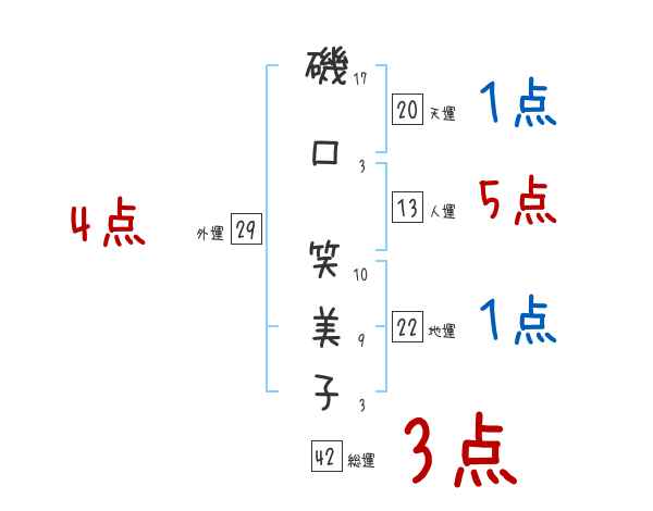 人運![]() | 磯口笑美子さんの人運は13画の5つ星!才能に恵まれ人気がある。名声を手に入れる。円満な人生。 性格や才能などを表す2番目に重要な運勢です。人間関係や協調性、社会的な成功に影響します。主に20歳から50歳ぐらいまでの中年期の運勢を表します。 |