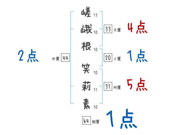 外運![]() | 嵯峨根笑莉素さんの外運は44画の2つ星!誠実で慎重な性格。物事を考えすぎないように注意しましょう。 生活面を象徴する運勢です。外部から受ける影響力を表し、結婚運、家庭運や職場、環境への順応性を表します。 |