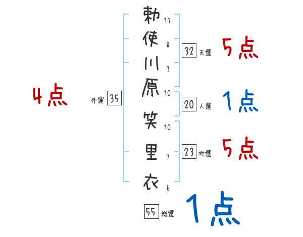 外運![]() | 勅使川原笑里衣さんの外運は35画の4つ星!温厚な性格で感受性が高い。穏和な性格で人望が厚い。 生活面を象徴する運勢です。外部から受ける影響力を表し、結婚運、家庭運や職場、環境への順応性を表します。 |