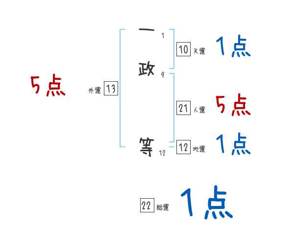 人運![]() | 一政等さんの人運は21画の5つ星!統率力がある。独立し成功する。名誉を手に入れる。 性格や才能などを表す2番目に重要な運勢です。人間関係や協調性、社会的な成功に影響します。主に20歳から50歳ぐらいまでの中年期の運勢を表します。 |