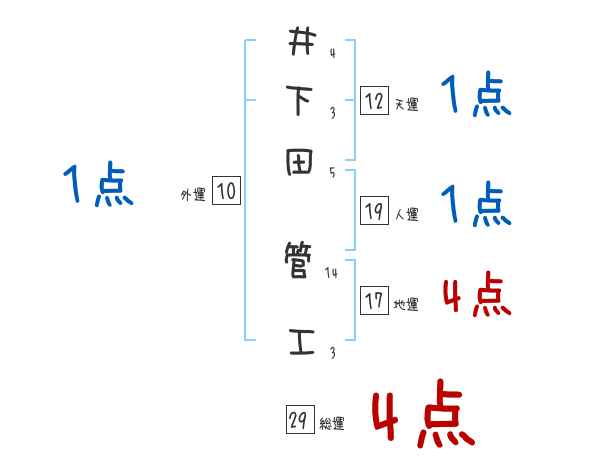 人運![]() | 井下田管工さんの人運は19画の1つ星!優れた才能を持ちますが、協調性が足りないことも。周りの人と協力する事を意識しましょう。 性格や才能などを表す2番目に重要な運勢です。人間関係や協調性、社会的な成功に影響します。主に20歳から50歳ぐらいまでの中年期の運勢を表します。 |
