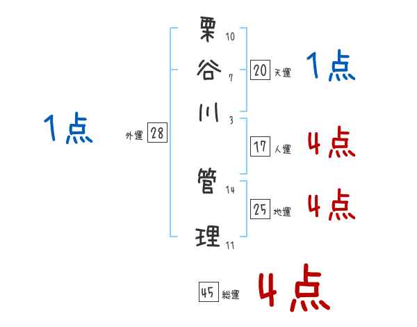 外運![]() | 栗谷川管理さんの外運は28画の1つ星!家庭環境に注意。スポーツで活躍できる能力があるかも。 生活面を象徴する運勢です。外部から受ける影響力を表し、結婚運、家庭運や職場、環境への順応性を表します。 |