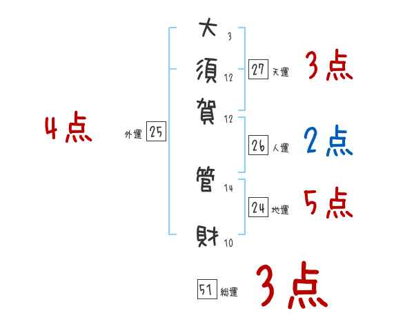 総運![]() | 大須賀管財さんの総運は51画の3つ星!変化が激しく、危険に注意。堅実な性格。 あなたの人生を表す1番重要な運勢です。生涯を通じて影響する総合運となり、主に50歳以降の晩年期に影響を及ぼします。 |
