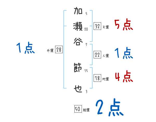 天運![]() | 加瀬谷節也さんの天運は32画の5つ星!柔軟性があり成功する。チャンスが多く金運が良い。 家系が持つ宿命的な運勢を表します。祖先から受け継いだ苗字ですので自分の力が及びません。家柄を象徴します。 |