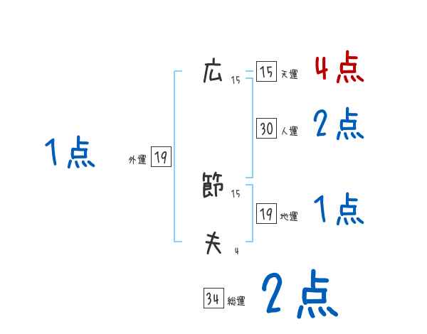 外運![]() | 広節夫さんの外運は19画の1つ星!優れた才能を持ちますが、協調性が足りないことも。周りの人と協力する事を意識しましょう。 生活面を象徴する運勢です。外部から受ける影響力を表し、結婚運、家庭運や職場、環境への順応性を表します。 |