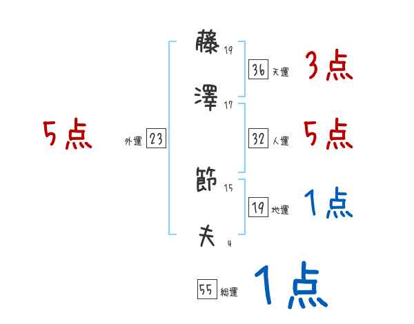 人運![]() | 藤澤節夫さんの人運は32画の5つ星!柔軟性があり成功する。チャンスが多く金運が良い。 性格や才能などを表す2番目に重要な運勢です。人間関係や協調性、社会的な成功に影響します。主に20歳から50歳ぐらいまでの中年期の運勢を表します。 |