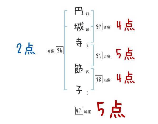 総運![]() | 円城寺節子さんの総運は47画の5つ星!実力が開花し発展する円満な人生。財に恵まれる。 あなたの人生を表す1番重要な運勢です。生涯を通じて影響する総合運となり、主に50歳以降の晩年期に影響を及ぼします。 |