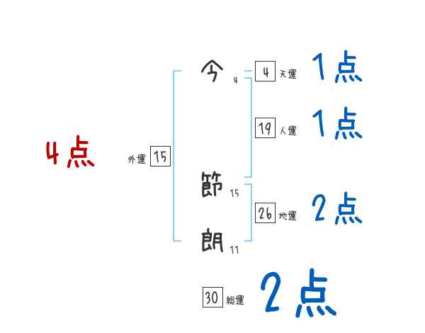 天運![]() | 今節朗さんの天運は4画の1つ星!感情が不安定で苦労するかも。周囲との協調を心掛けましょう。 家系が持つ宿命的な運勢を表します。祖先から受け継いだ苗字ですので自分の力が及びません。家柄を象徴します。 |