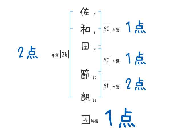 外運![]() | 佐和田節朗さんの外運は26画の2つ星!波瀾万丈かも。信頼できる人を大事にしましょう。 生活面を象徴する運勢です。外部から受ける影響力を表し、結婚運、家庭運や職場、環境への順応性を表します。 |