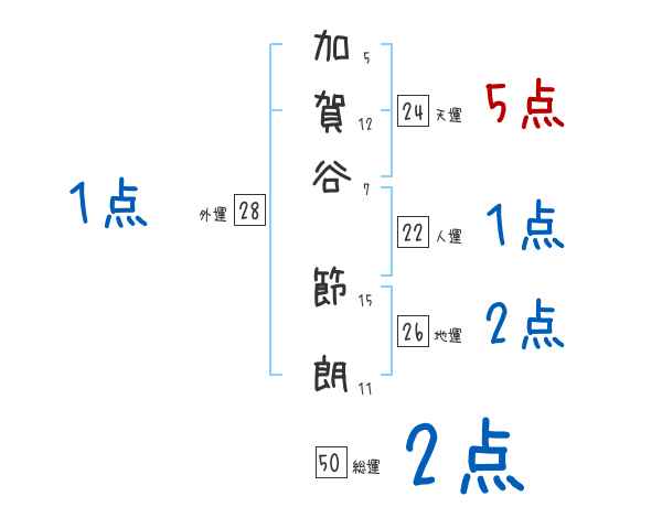 天運![]() | 加賀谷節朗さんの天運は24画の5つ星!家庭運が良く順調な人生。金運にも恵まれる。 家系が持つ宿命的な運勢を表します。祖先から受け継いだ苗字ですので自分の力が及びません。家柄を象徴します。 |
